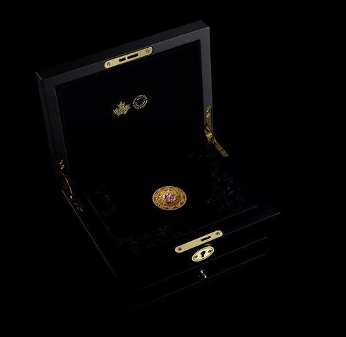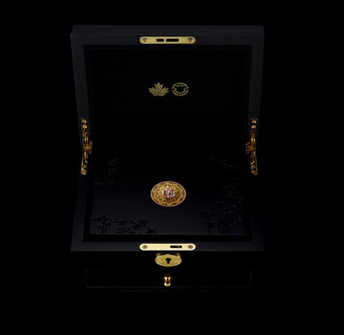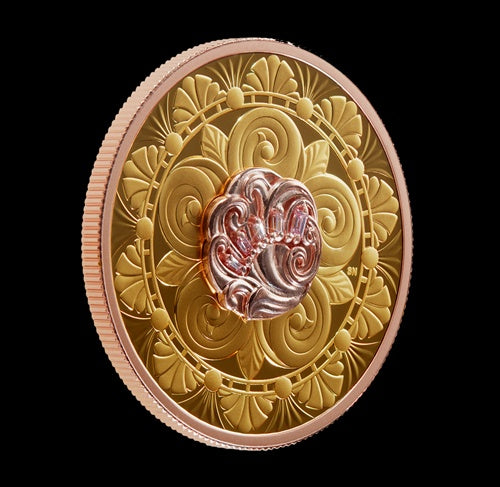Introducing Treasure, a stunning collectible that combines the rich gleam of 99.99% pure gold and the inimitable sparkle of some of the rarest diamonds in the world—a dream pairing. Inspired by Art Deco architectural elements, Treasure’s impeccably engraved design features a stylized cherry blossom with swirling petals that repeat on the coin’s obverse.