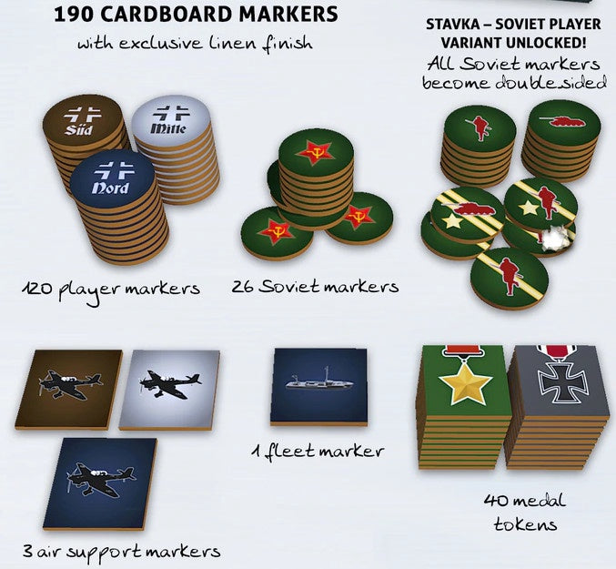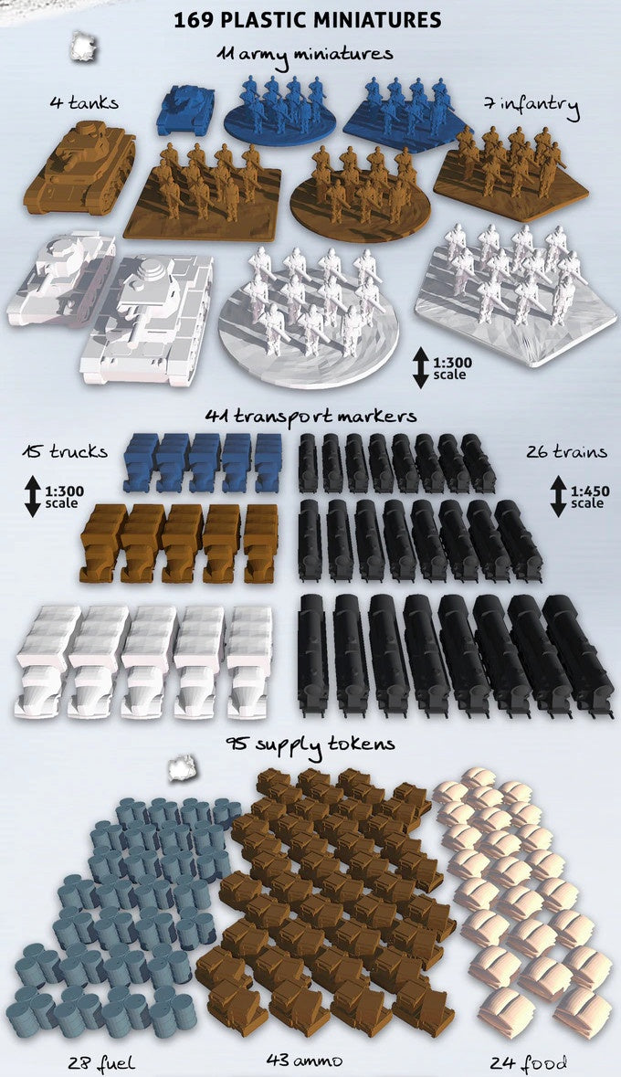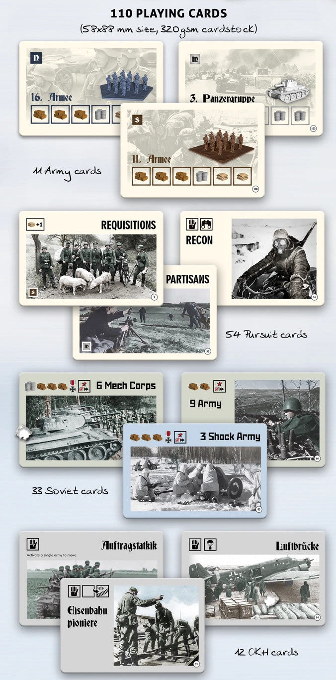 The players’ job is to keep the logistics chain working, to make sure the Blitzkrieg moves as quickly as possible, and the targets are reached on time. This means the players will have to supply fuel to the tanks, ammo to the guns, food to the troops, and fodder to the horses. The player who acquires the most medals wins the game. Players can also bet everything on one strike and finish the war by conquering Moscow (or Leningrad, or Rostov).