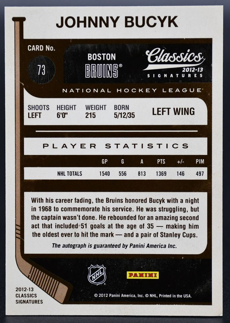 Carte autographiée de Johnny Bucyk (n° 73) des Bruins de Boston, collection Panini Classics Signatures 2012-2013