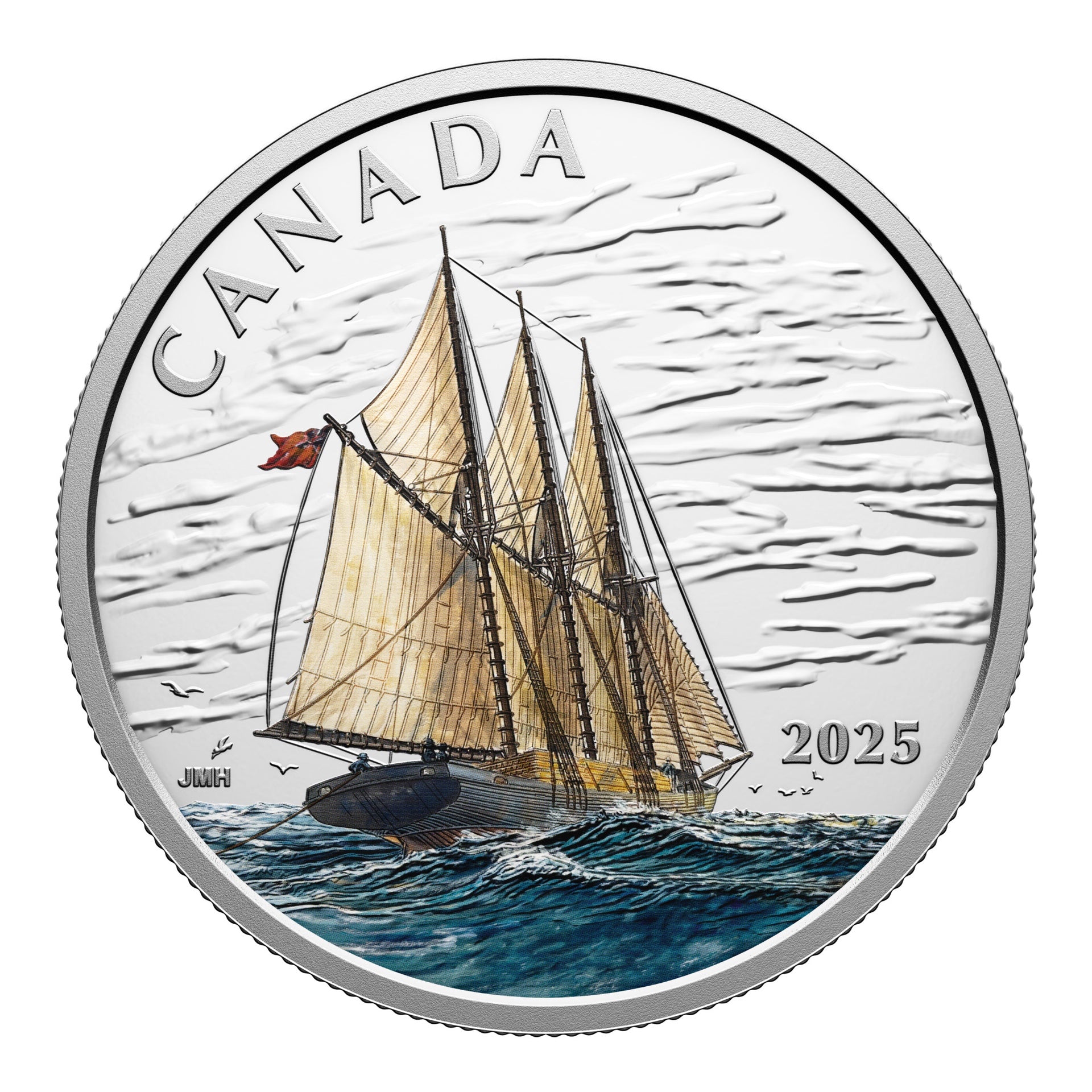 Vous remarquez le drapeau rouge au revers de votre pièce ? Il s’agit du pavillon rouge canadien, le pavillon nautique arboré par les navires canadiens à partir des années 1890, et qui a également servi de drapeau de facto au Canada après la Confédération. Combinant l’Union Jack et des variantes des armoiries du Canada, le pavillon rouge canadien a été modifié à plusieurs reprises, mais n’a jamais été officiellement adopté comme drapeau national du Canada ; il a finalement été remplacé par le drapeau à la feuille d’érable en 1965.