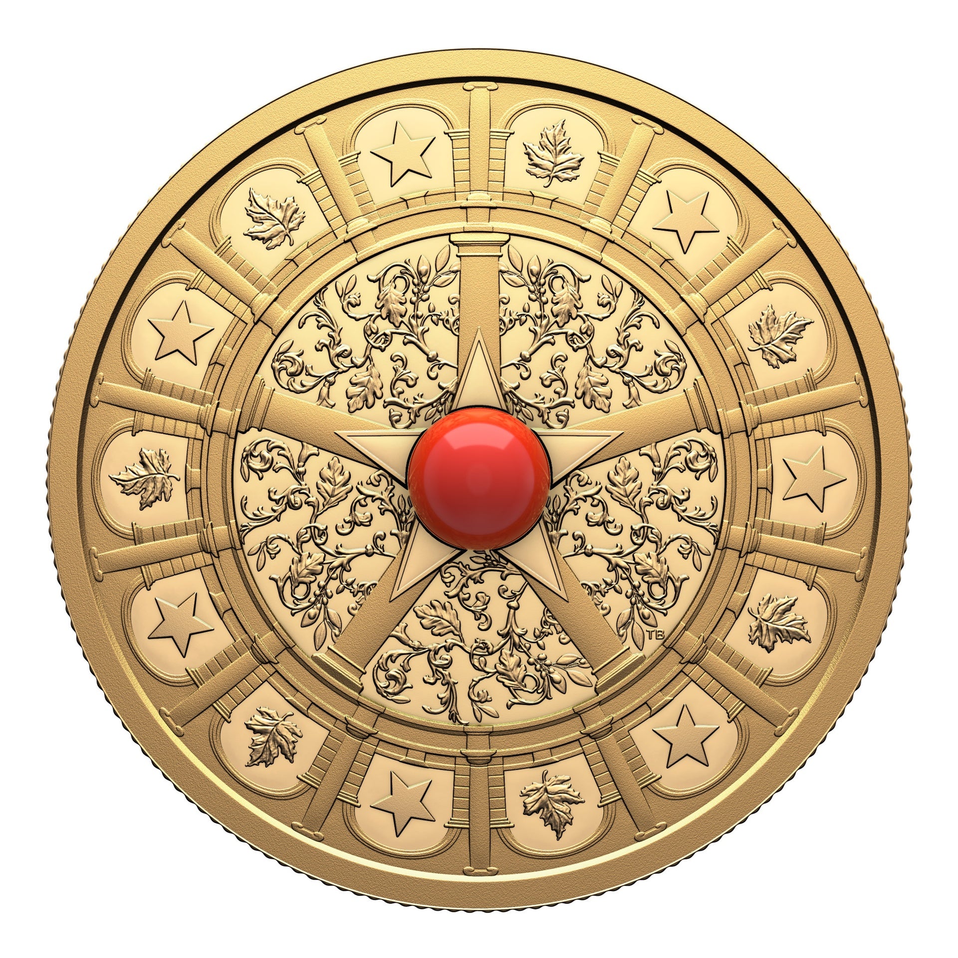 “As the Canadian child of an Italian immigrant, I know firsthand the blending of two cultures. I wanted to use symbolism in this design to merge two cultures together, hence the repetition of the Star of Italy and the maple leaf throughout. There are patterns and elements from the architecture and style of Italy, woven together in a new way to create an Italian-Canadian motif. Oak leaves, maple leaves, columns, arches and renaissance patterns all blend to indicate the marriage of two cultures.” – Tony Bianco, Artist