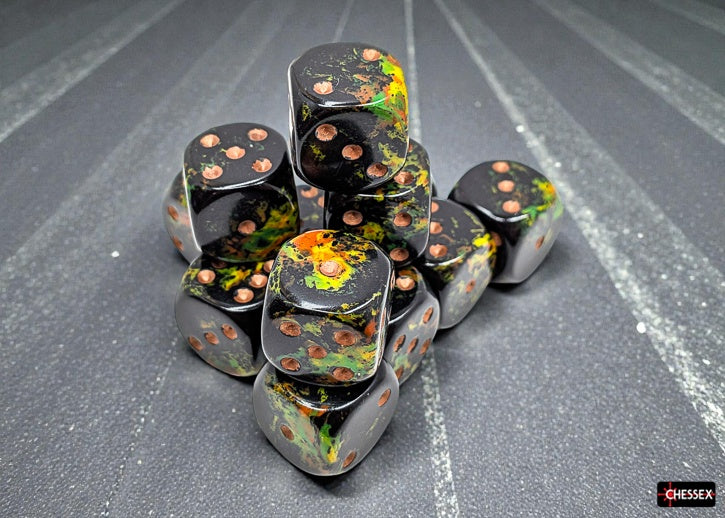 Each set contains 12 Brush™ Deep Forest™ 16mm d6 dice with gold pips (DU1605) in 02805 Display Case w/Lid and Foam Square
