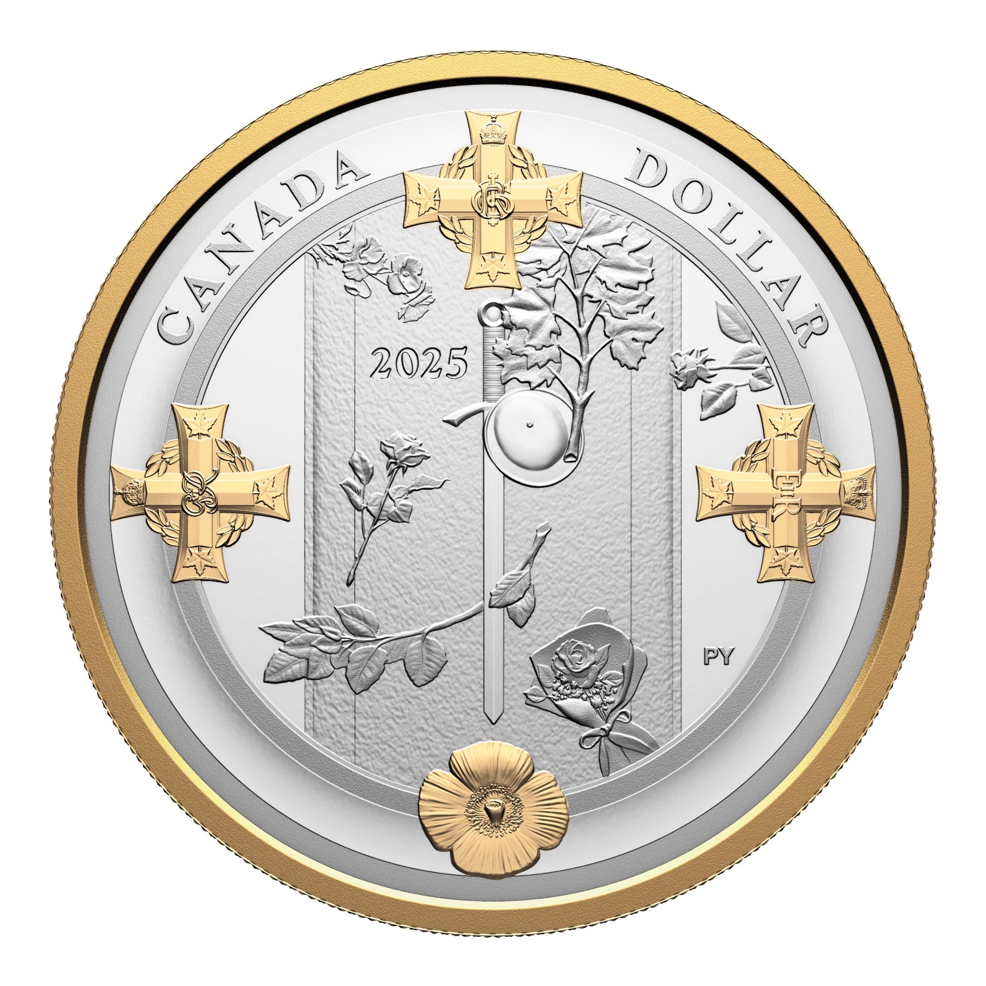 This seven-piece Proof Set contains a selectively gold-plated version of the 2025 Fine Silver Proof Dollar, which marks the 25th anniversary of the completion of the Tomb of the Unknown Soldier at the National War Memorial in Ottawa, Ontario. A set exclusive, the coin’s reverse is enhanced with yellow gold that highlights the Tomb’s four corner pieces, as well as the outer edge that frames this circular interpretation of one of Canada’s most hallowed monuments.