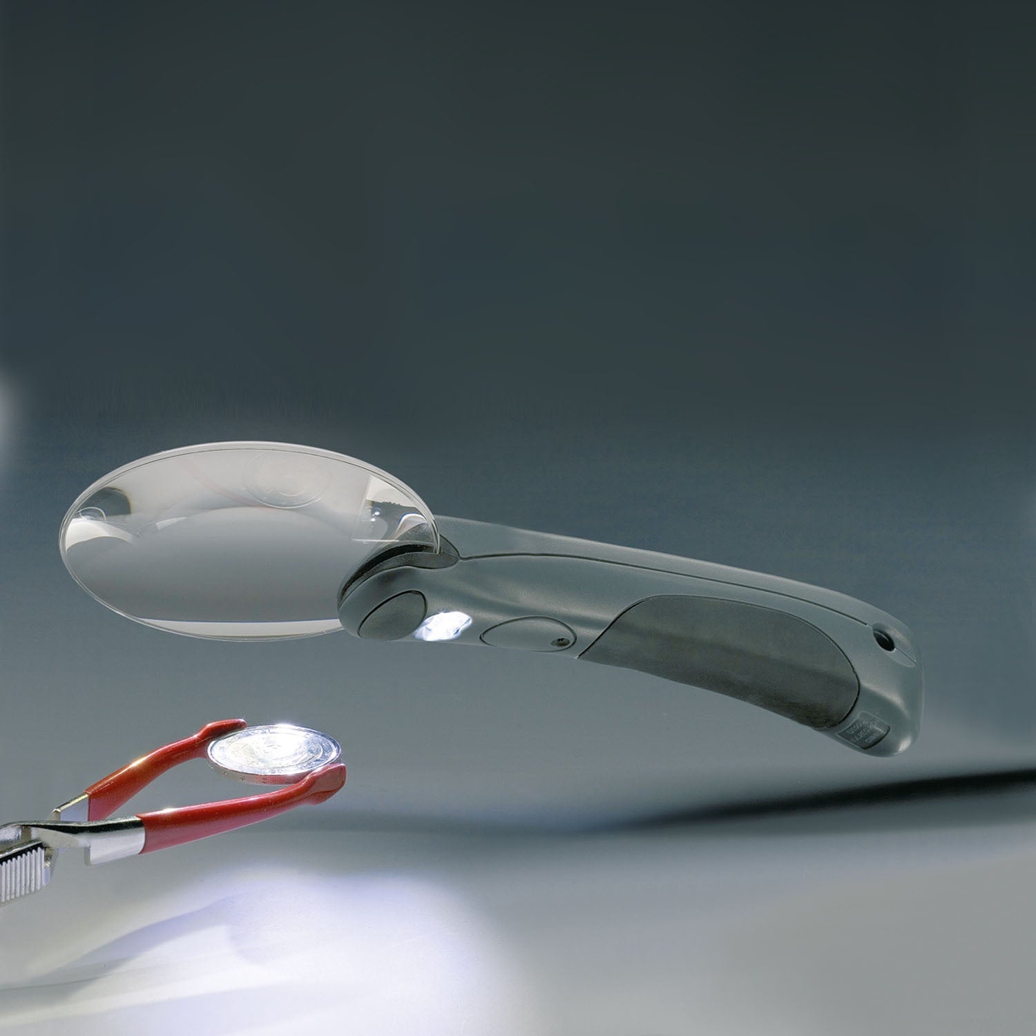 Rimless LED light magnifier with premium acrylic lens and ergonomic hand grip in modern design. 2.5x magnification as well as integrated spot lens for viewing details. Lens diameter: 90 mm. Battery operated incl. Three SR 54 button cells. Including protective lens pouch. The product packaging is in English.