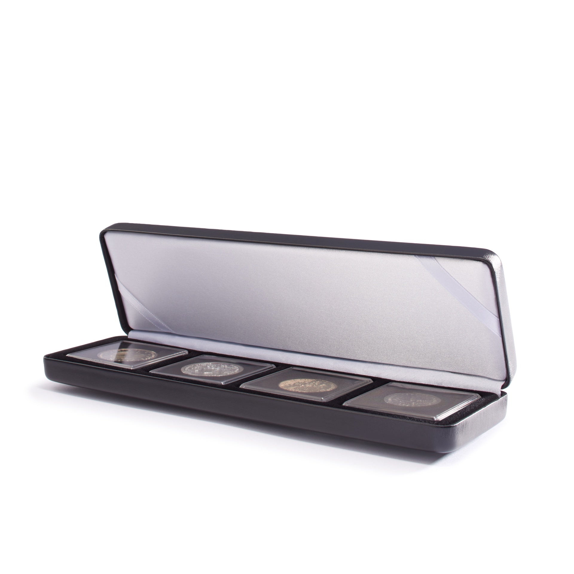 For the most elegant presentation of encapsulated coins may we recommend these high-quality coin boxes with silk-lined lid. A satin ribbon inside the lid can hold a certificate if desired. A sturdy metal frame protects the coin and thus makes it perfectly safe for postage as well as storage. Also suitable for QUADRUM square coin capsules. Suitable for LIGHTHOUSE QUADRUM capsules.