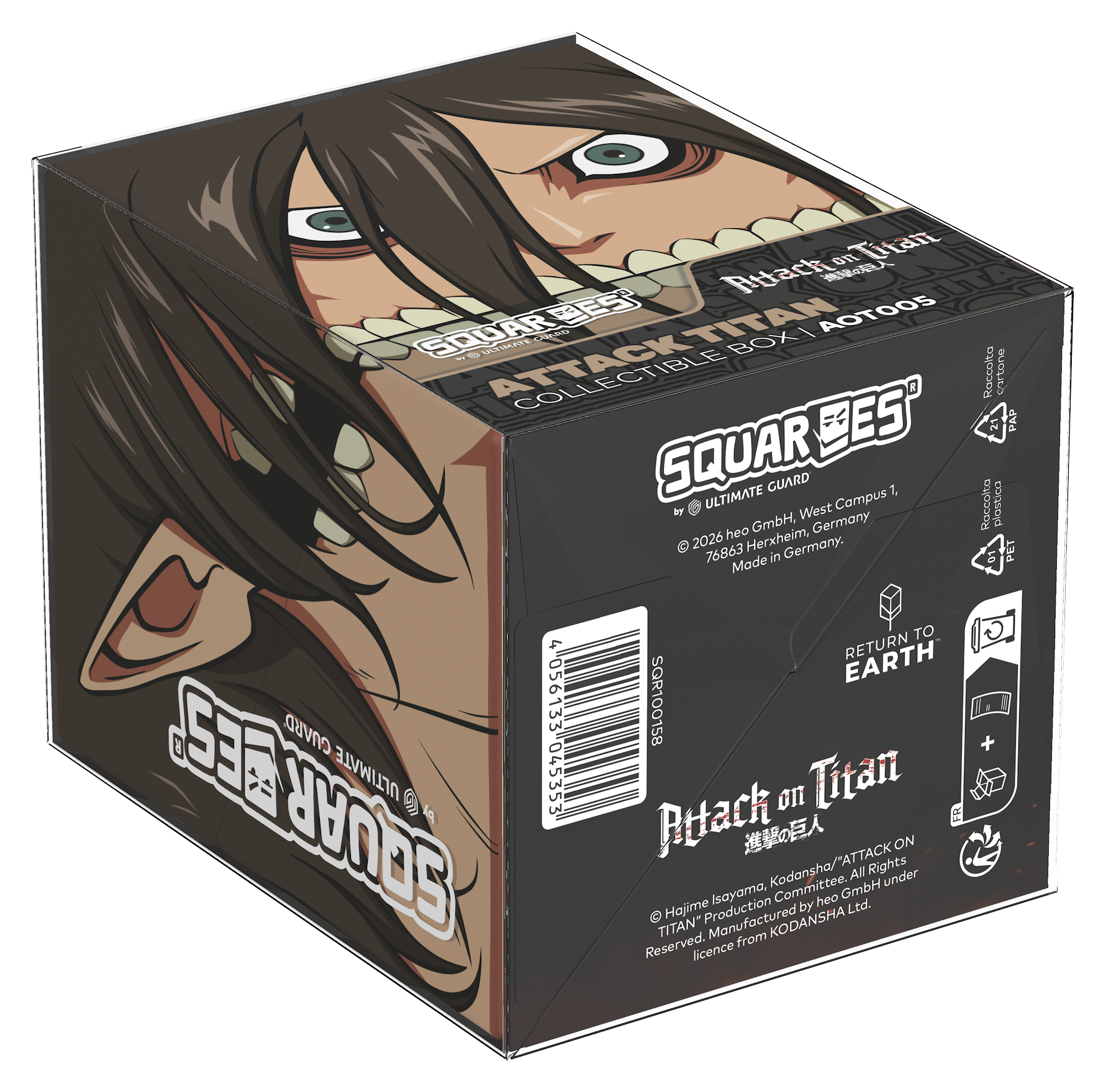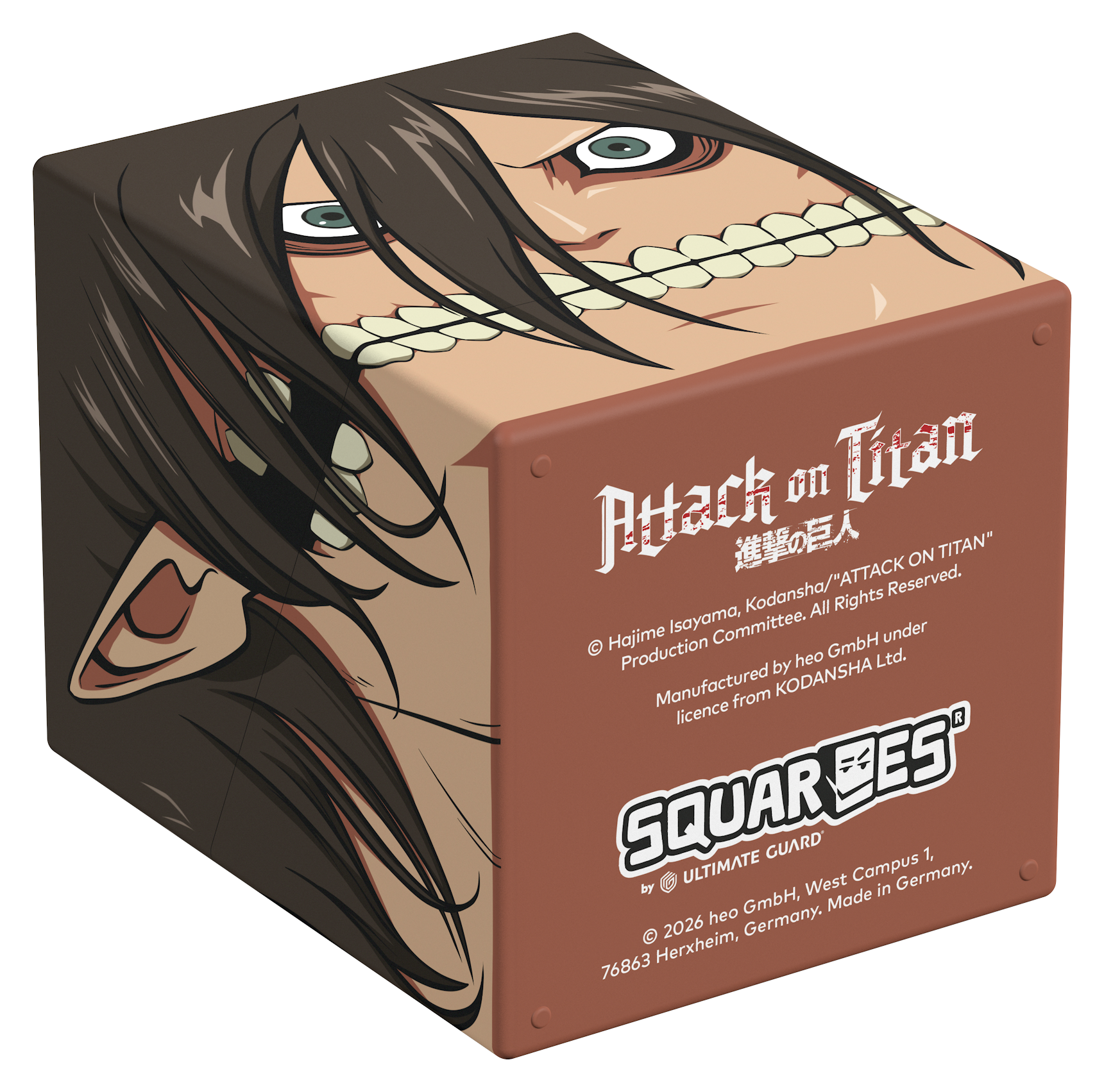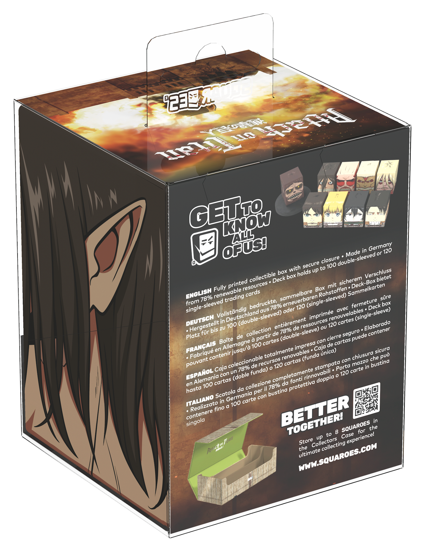 Collectible box for storing TCG decks, tabletop gaming accessories, and/or collectibles. The Attack Titan Squaroe from the Attack on Titan edition holds up to 100 cards in double protective sleeves if used as a deck box. Squaroes are made from 78% renewable resources and fit perfectly into the separately available Collectors Case.