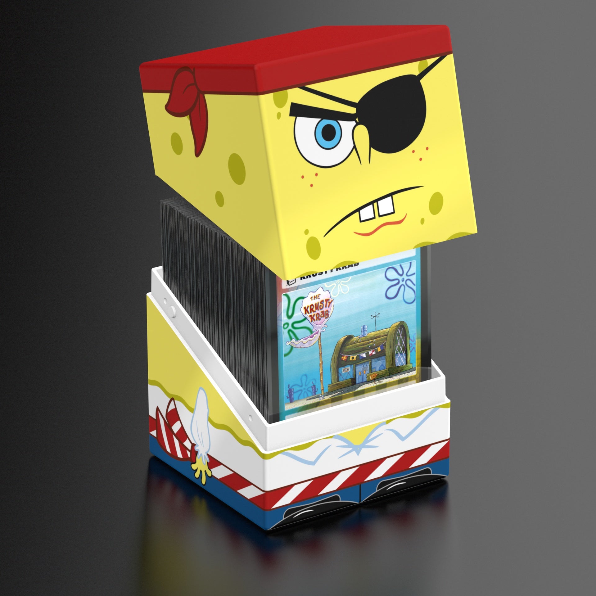 Collectible box for storing TCG decks, tabletop gaming accessories, and/or collectibles. The Pirate SpongeBob Squaroe from the SpongeBob SquarePants™ edition holds up to 100 cards in double protective sleeves if used as a deck box. Squaroes are made from 78% renewable resources and fit perfectly into the separately available Collectors Case.