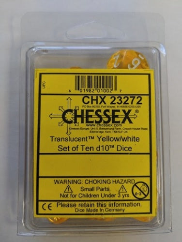 Translucent 10-Die Set D10 Yellow W / White Chessex Dice (CHX23272)