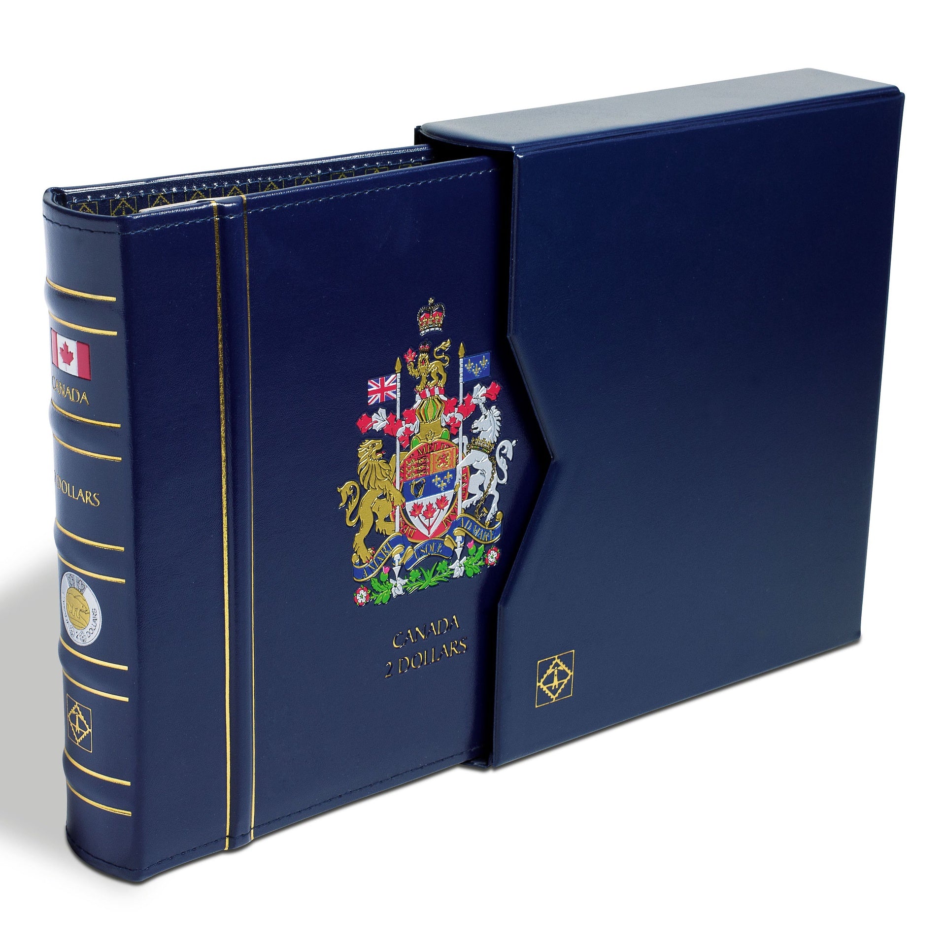 Build your own collection in this beautiful, hand-made album. The 4-ring binder with its impressive cover design features a reinforced spine and elegant inner lining with finely stitched seams. The storage system with clear sliding inserts (free from acid and chemical softeners) is safe and east to use. It alows coins to be viewed from either side. The album comes with 2 blank pages. For added protection there is a matching slipcase included. Overall size: 8 3/4 x 9 7/8 x 2 1/4 " (222 x 251 x 58 mm).